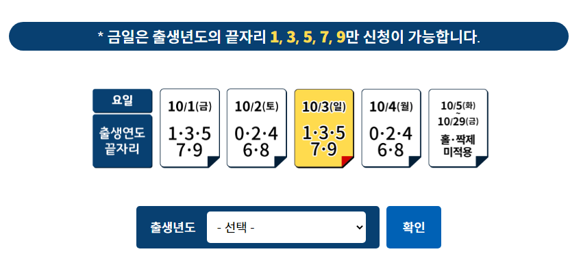 - 10월 2일, 4일 : 출생년도 끝자리 짝수 인자 1972년생인 경우 10월 2일이나 4일에 신청이 가능하며, 10월 5일 이후에는 홀짝제 적용 없이 대상자 모두 신청할 수 있다.