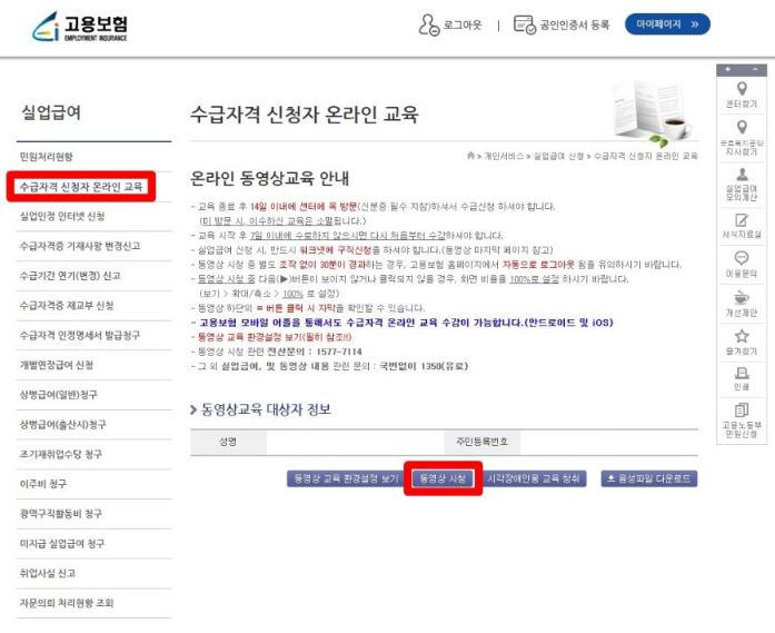 - 동영상 시청 후 별도 조작 없이 30분이 경과하면, 고용보험 홈페이지에서 자동 로그아웃 되므로 유의해야 한다.