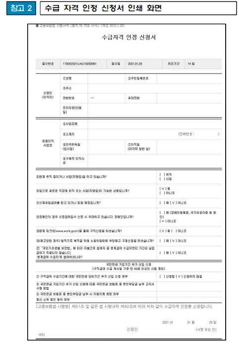 - 그 후 고용복지플러스센터에 직접 방문하여 본인 확인 및 실업 신고 절차를 완료하면 수급자격 신청절차가 완료된다.