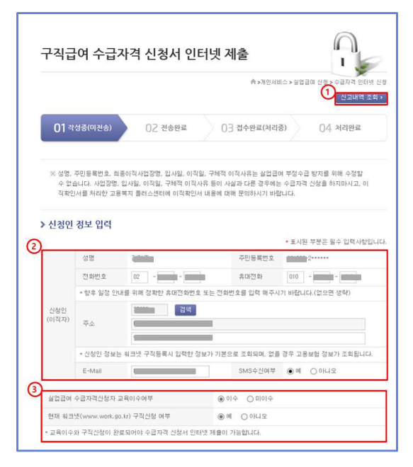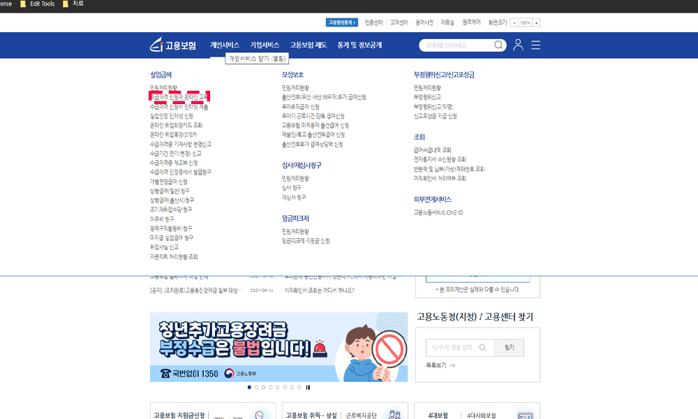 - 개인서비스 > 실업급여 > 수급자격 신청서 인터넷 제출을 클릭한다.