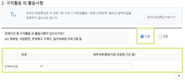 - 구직활동 외 활동사항이 있을 경우 체크하시고 필수 항목을 입력한다.
