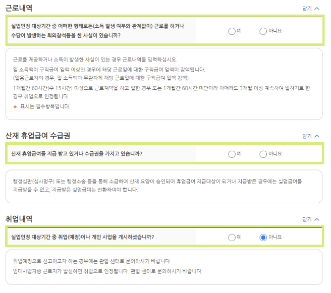 - 실업인정 대상 기간 중 취업(예정)이나 개인 사업을 개시한 경우 체크하고 아래 내용을 확인한다.