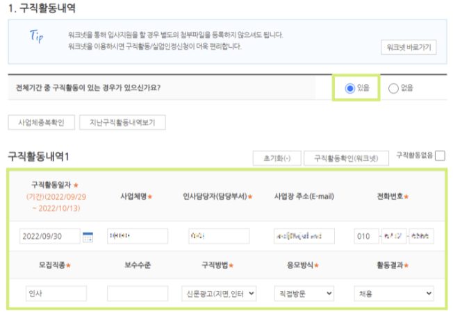 - 구직활동 내역의 필수항목을 입력한다.