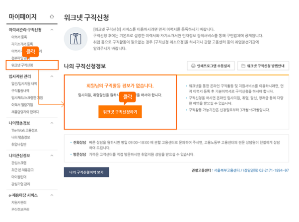- 워크넷 구직신청 > 워크넷 구직신청하기 클릭한다.