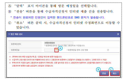 - 전송 버튼 클릭 시, 방문 예정정보(방문예정센터, 방문 예정일)를 입력하는 팝업이 호출된다.