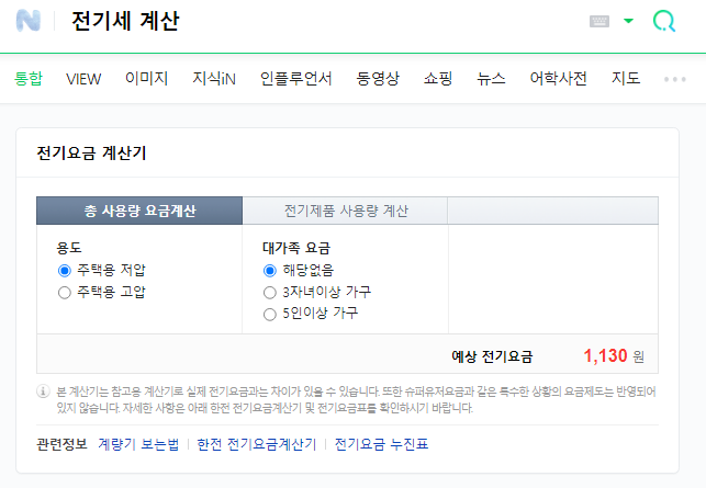 그 후에 전기제품 사용랑 계산을 검색하여 제품을 에어컨으로 선택하고 아까 체크한 소비전력을 입력한 뒤에, 사용 시간을 입력하면 사용량이 표시됩니다.